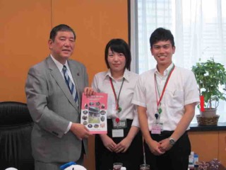 終始和やかな雰囲気のなか、多少緊張気味だった学生も、自分の意見を大臣に直接報告できたことや励ましの言葉をいただいたことで、今後の活動への決意を新たにしました。最後に、自分たちで作成した観光パンフレット『めぬま観光読本。』を手に、石破大臣と記念撮影をしました。(担当:片柳 勉)