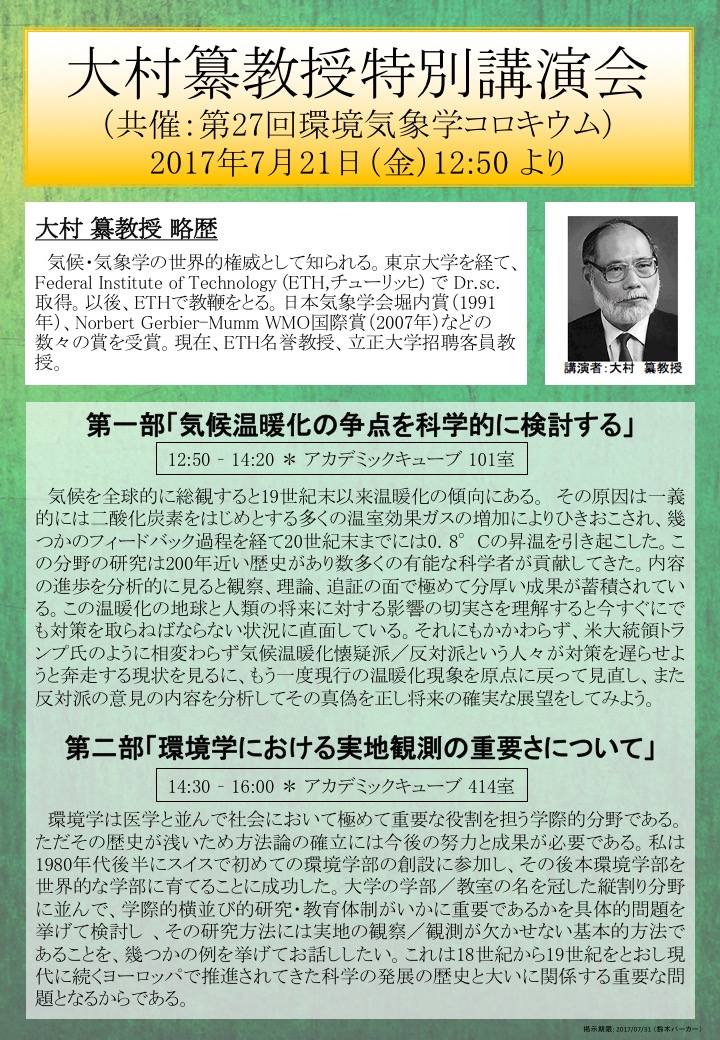 本学招聘客員教授の大村纂教授(チューリッヒ工科大学名誉教授)をお招きし、特別講演会(共催:第27回環境気象学コロキウム)を開催いたします。気候・気象学の世界的権威として知られ、長年ヨーロッパで活躍されてきた著名な先生です。「地球温暖化懐疑論」とそれに対する科学的応答など、日本で普通に生活しているとあまり触れることのない話題などをお話ししてくださる予定です。