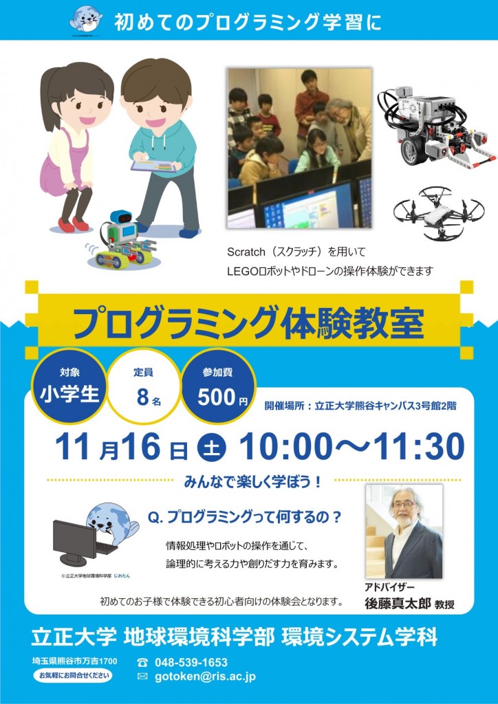 学生によるプログラム教室を再開します!! 2024年11月14日 11/16 (土)より学生によるプログラム教室を復活します。詳しくはチラシを御覧ください。 今回は小学生3年―6年生を対象に、環境システム学科環境情報学分野後藤研究室の大学院生と学部生の指導により、LEGOロボットをスクラッチで書いたプログラムで動かし、考えた通りに動かします。 プログラム教室は2016年4月から2018年までほぼ毎月、立正生がNPO法人AEAと協働で開催してきましたが、コロナ禍により中断しておりました。 今回の体験学習の後、定期的に開催する計画です。是非ご参加ください。 « 前の記事 次の記事 »