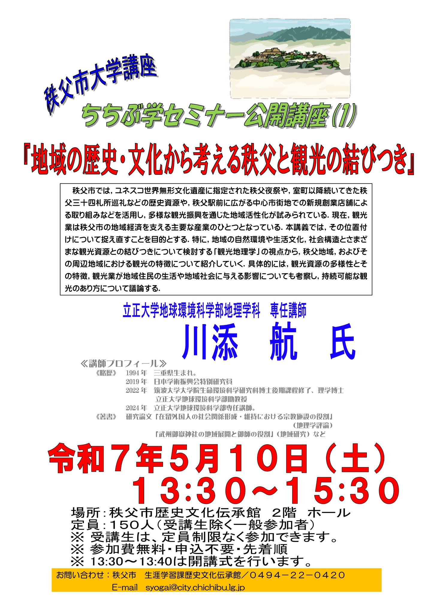令和7年度「ちちぶ学セミナー」において地理学科の川添 航 専任講師が講師を務めます