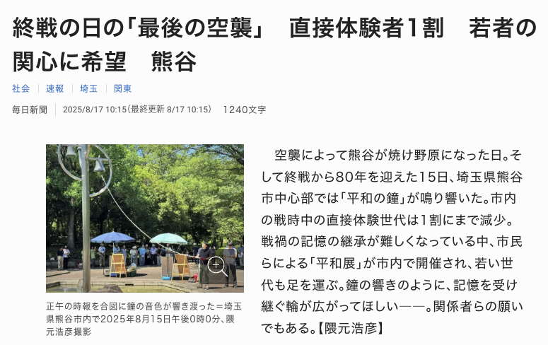 【メディア掲載】大学院生の活動が毎日新聞で取り上げられました! 2025年09月01日 大学院生の本多さん(D1)による「熊谷空襲」に関する研究活動が毎日新聞で取り上げられました! 詳細はこちら: 終戦の日の「最後の空襲」 直接体験者1割 若者の関心に希望 熊谷 « 前の記事 次の記事 »
