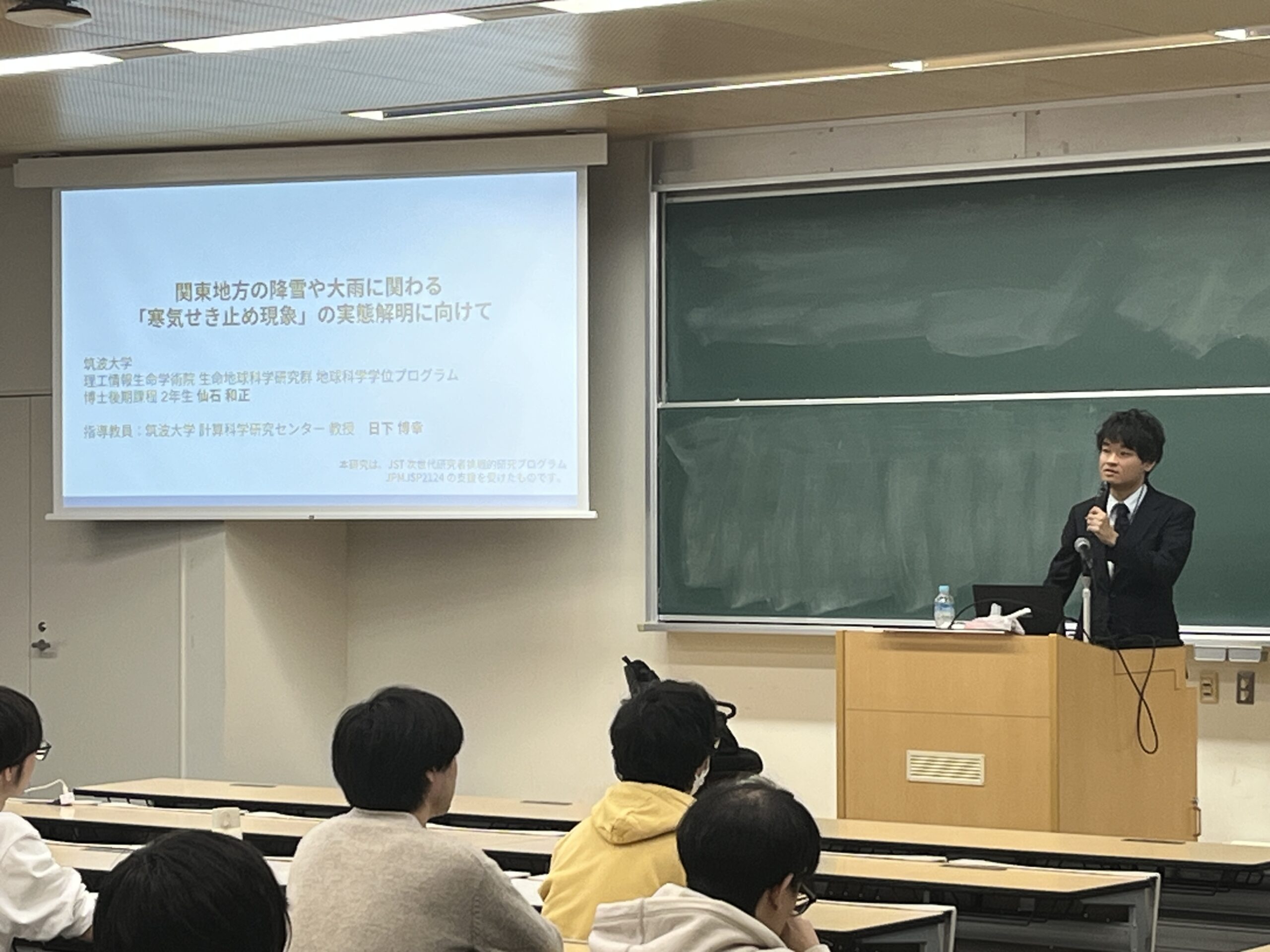 今回は、筑波大学大学院博士後期課程の仙石和正さんをお迎えし、関東地方の降雪や降雨に影響を及ぼす寒気せき止め現象(Cold Air Damming: CAD)に関する研究についてご講演いただきました。