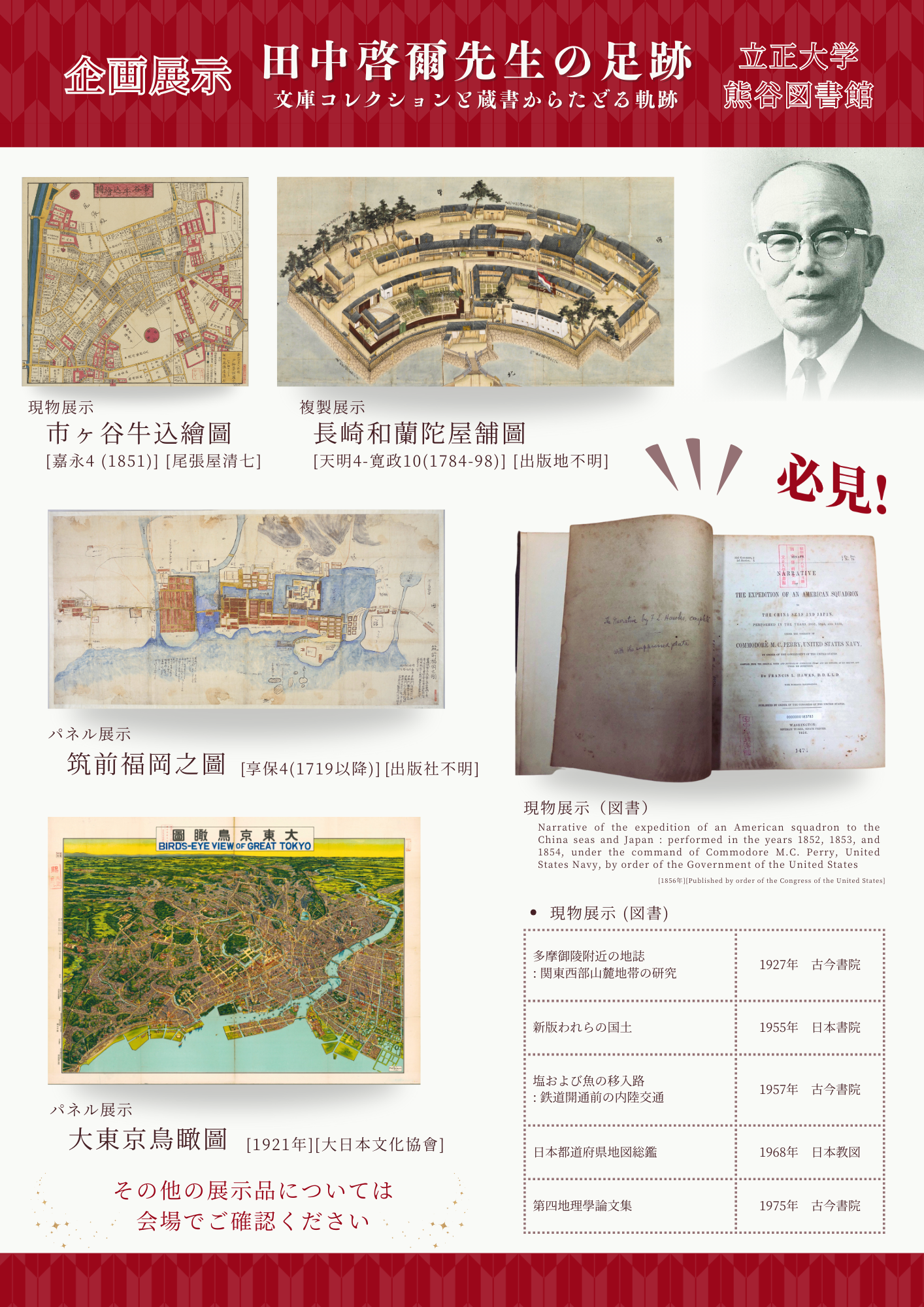 田中啓爾先生は日本における人文地理学発展の基礎を築いた地理学者であり,立正大学図書館には田中先生の寄贈図書「田中啓爾文庫」が所蔵されています.本年は田中先生の没後50年の節目の年であるため,先生に縁の深い地域の地図(複製)と著作を中心とした書籍を中心に,先生の足跡を辿る展示を行います.