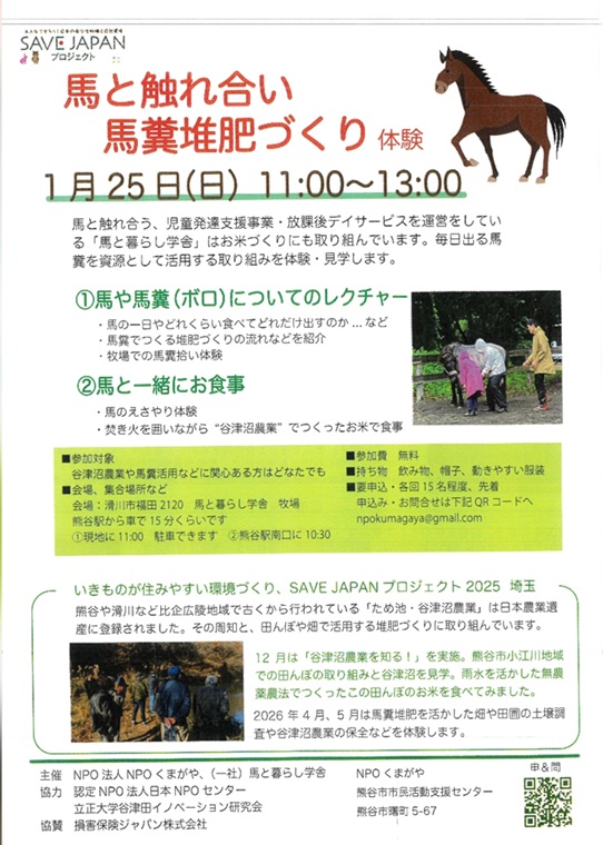 「SAVE JAPAN」は損保ジャパン・日本NPOセンターが、いきものが住みやすい環境づくりを目的に、全国各地の団体と15年前から実施しています。春には谷津沼の生き物調査や保全活動にも取り組みます。