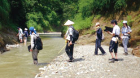 環境システム学科では、各学年において積極的にフィールドワークを実施しています。1年次に開講される「学修の基礎II」と「環境調査の基礎および実習」では、調査・研究に応じた頭と眼と手足の動かし方を習得します。2年次に開講される「フィールドワーク」では野外のフィールドを舞台に、専門分野に応じたさまざまな調査方法を修得します。これらの他にも、専門分野に関するさまざまなフィールドワークが開設されています。