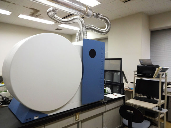 アルゴンプラズマによってイオン化した試料水中の元素を質量分析し、定性・定量分析を行う装置であり、通常多くの元素についてppt以下の超微量元素の分析が可能です。 また、本学のICP-MSにはレーザーアブレーション装置が接続されており、個体試料を直接分析することも可能です。岩石の微量成分組成や環境中の重金属の測定に利用しています。