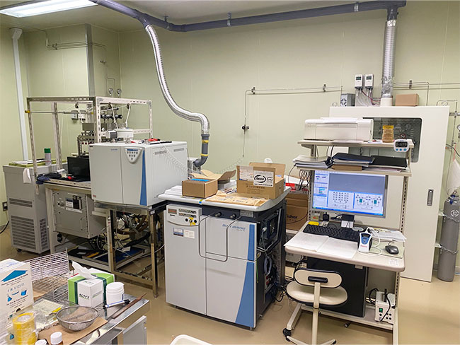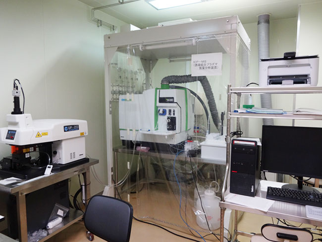 クラス100(1m3中の浮遊粒子数が100個以下)のクリーンルームには、誘導結合プラズマ質量分析計(ICP-MS)が設置されています。