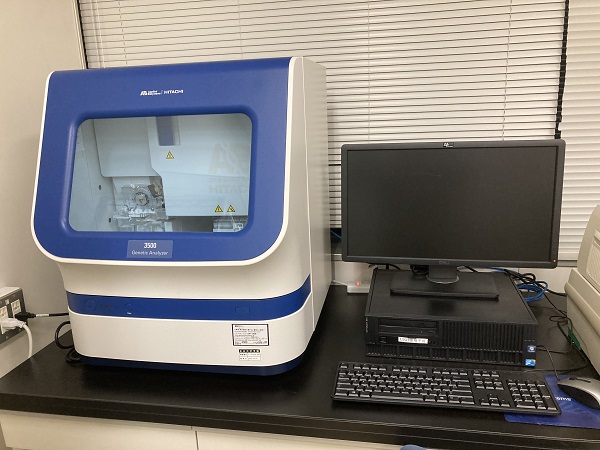 DNAの塩基配列を特定するDNAシーケンシング、およびマイクロサテライト等のDNAフラグメント解析を行なうことができます。8本キャピラリを備えており、キャピラリ長 50cmのものを主に使用しています。解析サンプルにもよりますが、1回のシーケンス解析で 700 塩基配列ほど、特定することができます。