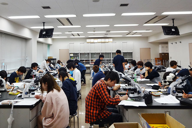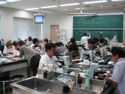 生物学系の実験室であり、顕微TVシステムを備えています。生物顕微鏡と双眼実体顕微鏡は学生全員に対して準備されています。また、学生実験時に使用する図鑑類、恒温培養器(インキュベータ)、クリーンベンチなどが設置されています。