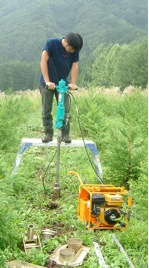 パーカッション採土器は採土管を打ち込んで地下数mまでの堆積物を採取する装置です。装置の概要:本採土器は油圧式のエンジン、打ち込み用ハンドブレーカー、採土管、引き抜き装置等から構成されます。 サンプル採取の際はエンジン打撃式で採土管を打ち込み、引き抜きは人力で行います。 サンプルの採取:パーカッション採土器は、表層の堆積物(沖積低地の堆積物、段丘面上のローム層、湿地堆積物、砂丘堆積物)を垂直方向に採取することが可能です。なお、サンプルはオールコアで採取されます。 標準的な掘削深度の限界は 5mですが、一度に 5mの掘削を行うことは不可能であり、実際は1mないし2mの採土管を組み合わせて採取を行います。本採土器は、自然露頭が少ない都市域での地層の採取や津波堆積物の採取などに絶大な威力を発揮しています。