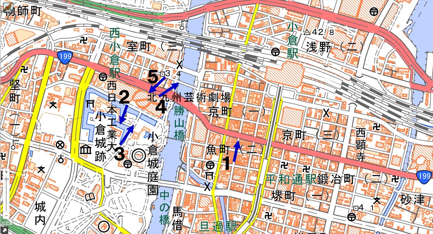 地図1 北九州市小倉北区の地図(地理院地図を使用。番号1~5は写真1~5の撮影方向を示している。)