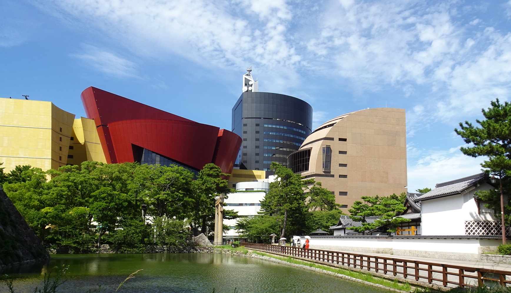 小倉城址の北側には「北九州市ルネッサンス構想事業」の一環として、2003年に大型複合商業施設「リバーウォーク北九州」が開業している。ここには、サービス・商業ゾーン、文化施設・情報発信ゾーン、大学棟などの白色・赤色・黄色・黒色などの建物群が接合している(写真3)。