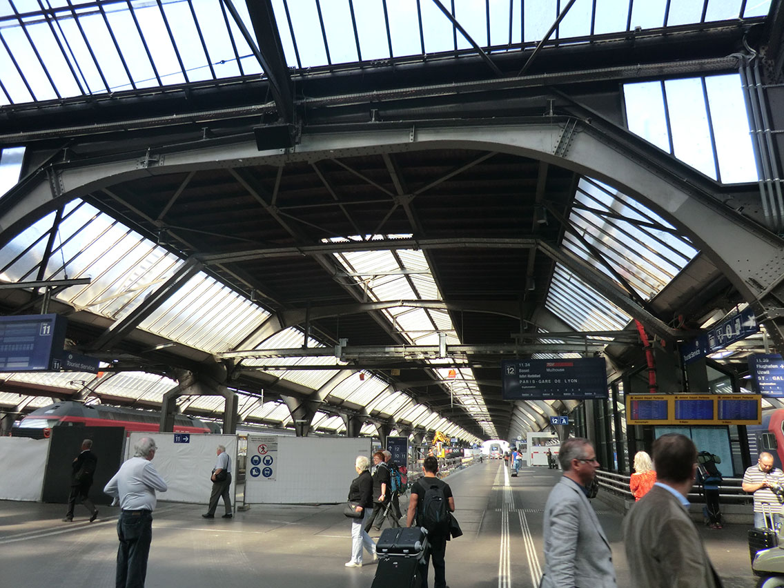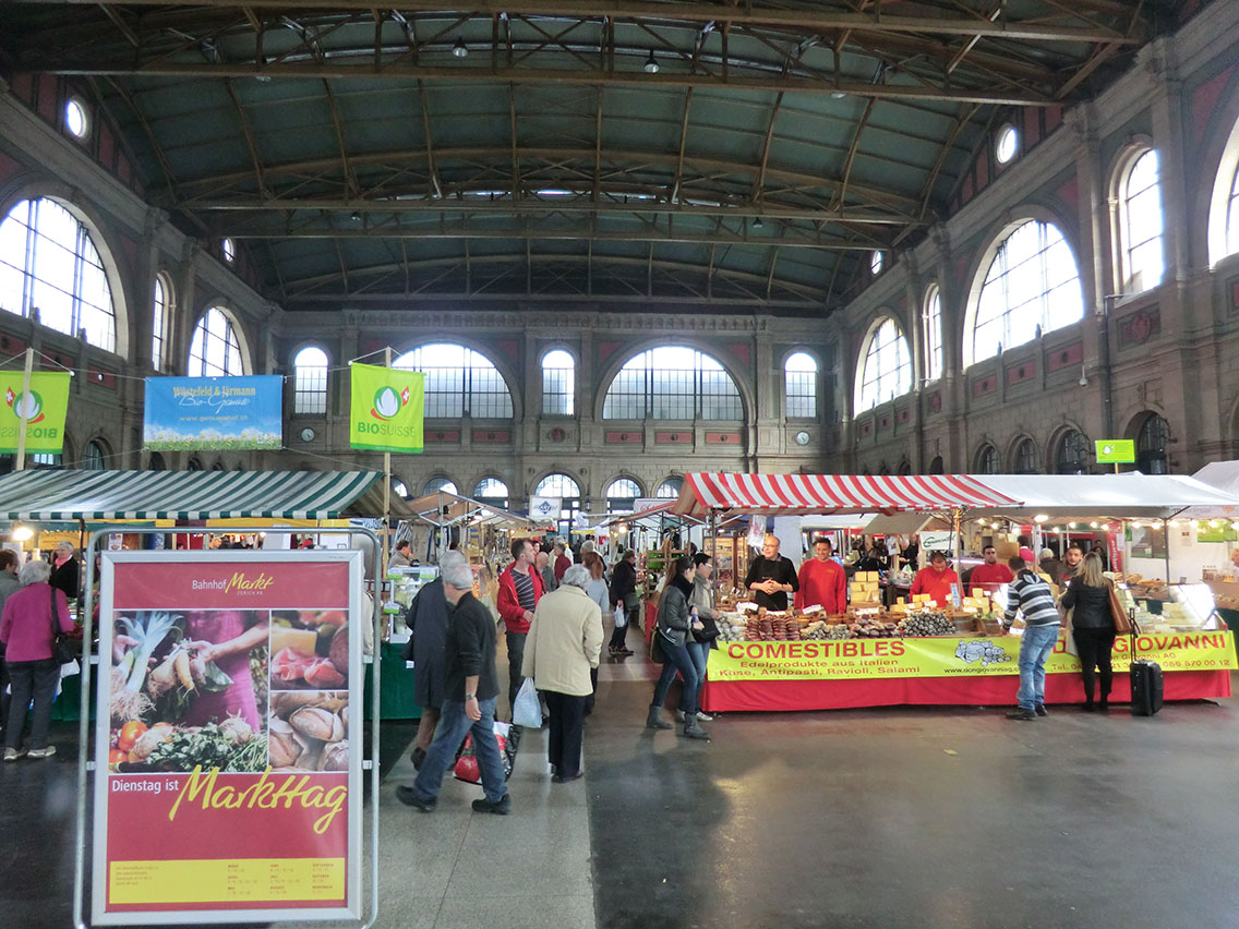 スイスのすべての鉄道駅は、乗車しなくても自由に出入りできる(写真2)。「改札口は?」「検札は?」と思われた方もいるだろう。スイスの検札は車内で実施されるため、駅構内はフリーパスである(写真3)。そのため、駅構内では多くのイベントが実施されている。たとえば、ファーマーズマーケット(写真4)やクリスマスマーケットなど。チューリヒに立ち寄った際は、ぜひチェックしよう。