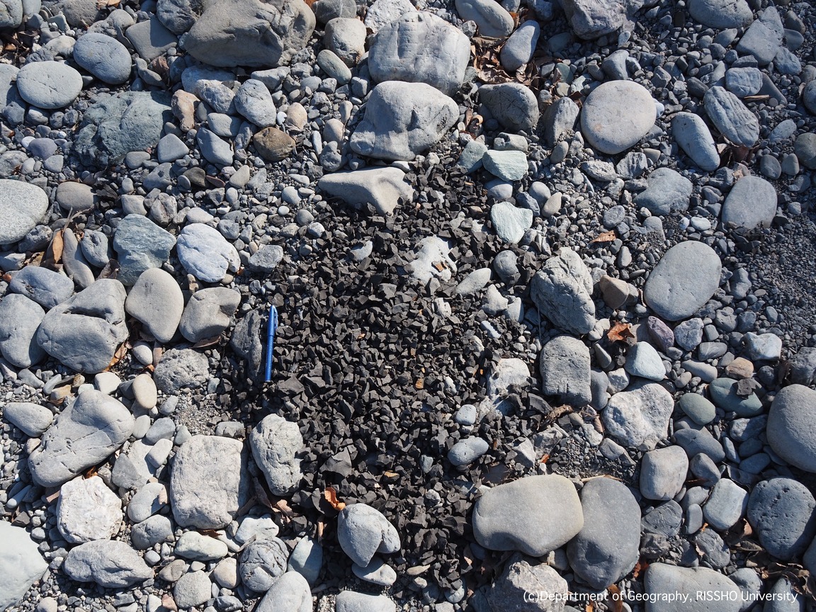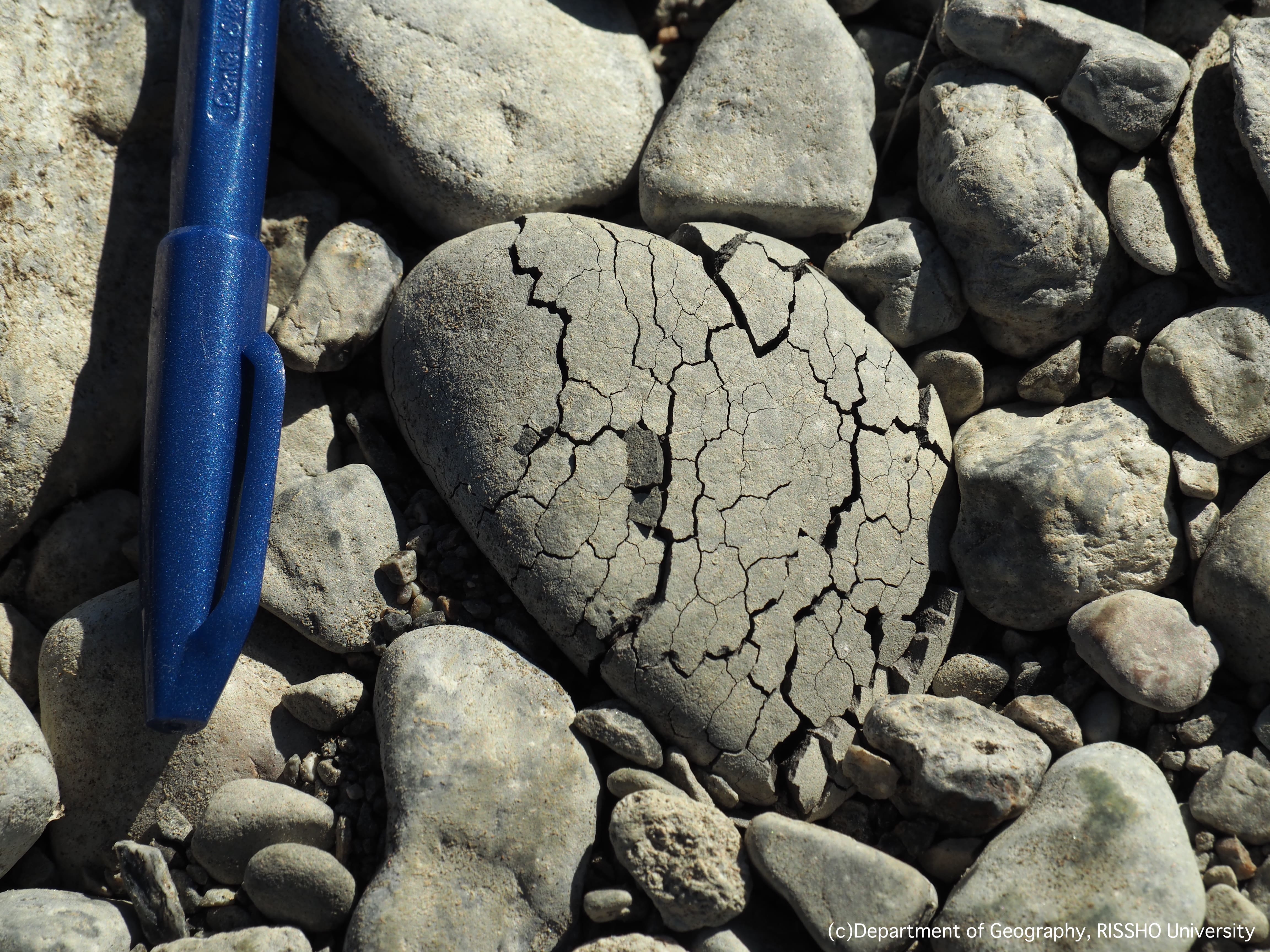 荒川上流部の河床には,上流の秩父盆地を経由して運搬されてきた円礫や亜円礫が多量に堆積している.秩父盆地の基盤をなす新第三紀中新世に形成された泥岩は,山崩れなどにより砕屑物となって荒川に運搬され,摩耗作用により丸みを帯びた礫となった.河床に堆積して時間が経過すると,雨水や河川水による吸水膨張と,日射による乾燥収縮を繰り返すうちに,亀裂が生じて分解が進む.泥岩には水を含む分子構造を持つ粘土鉱物が含まれており,同じ時代に形成された砂岩や礫岩に比べて乾湿風化作用により分解されやすい(写真1).すでに分解が進み,直径1㎝弱の角礫になったものある(写真2).