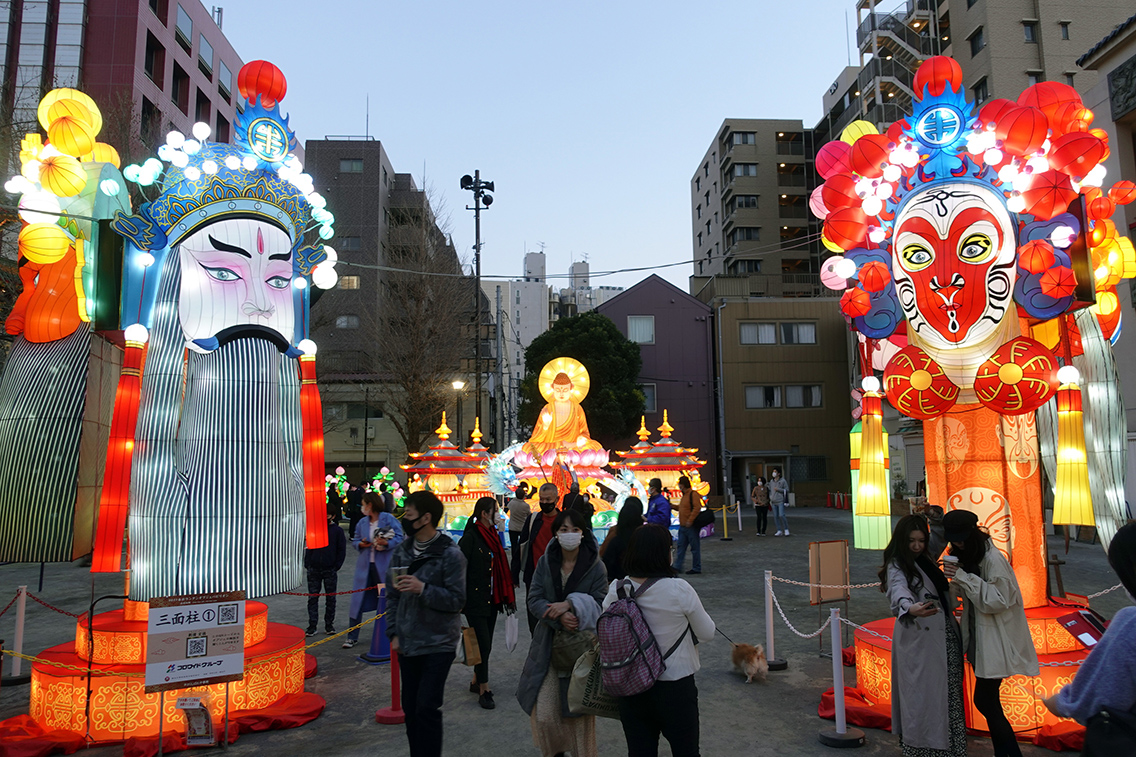 横浜中華街のメインストリート,中華街大通りは,黄金の龍のランタンなどの華やかなイルミネーションで飾られた(壁紙の写真)。横浜中華街の山下町公園(通称「小公園))では,2021年から「ランタンオブジェ パビリオン」という新しい催しが始められた。「西遊記」のストーリーに合わせた大小,様々なランタンは,絶好の撮影スポットとなった(写真1)。