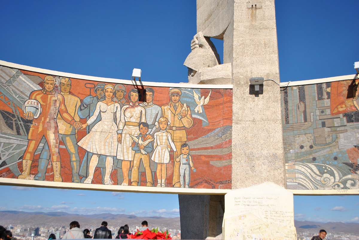 “ザイサン・トルゴイ(ザイサンの丘)”は,ウランバートルの南側に位置し,市街地やTuul川を一望できる小高い丘である.600段ほどの階段を上がった頂上には,1971年に建設されたソビエト兵士の記念碑がある.人民革命(1921年)およびハルハ川の戦い(1939年)でのソビエトでの援助に友愛を示すもので,円形の色鮮やかなモザイク画(写真2)が登頂者を出迎える.この丘の周辺(特に南側)では,地主が銘々にマンションやアパートを建設するため,建物は様々な方向を向いて乱立した.ザイサンの丘周辺のみならず,市街地の多くで統一性の図られていない街の景観を生むこととなってしまった(表写真).